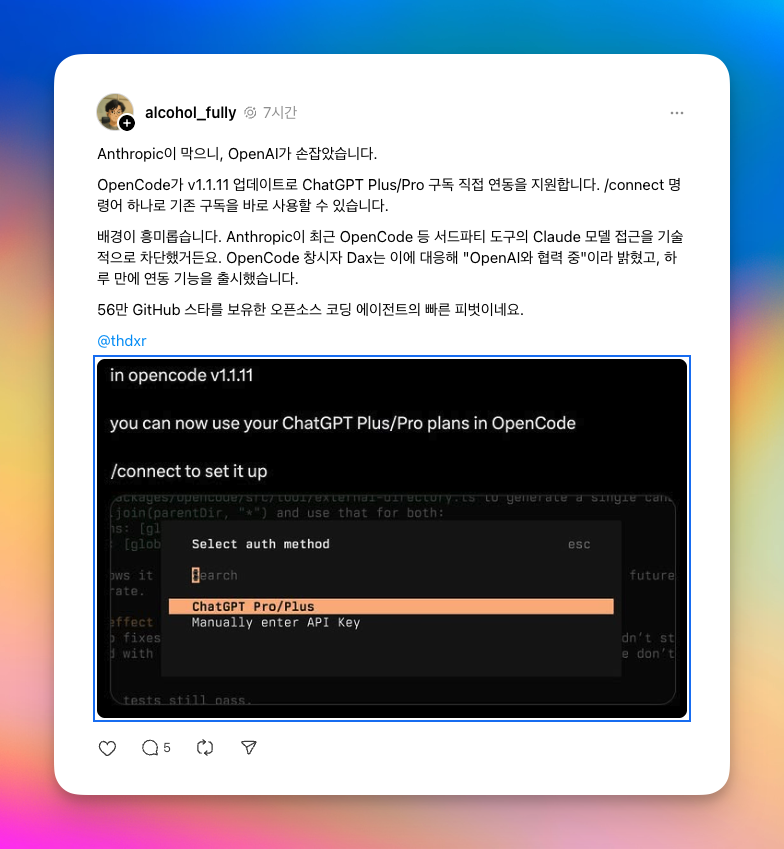 OpenCode ChatGPT 연동 발표Anthropic의 차단에 대응하여 OpenCode 창시자 Dax는 "OpenAI와 협력 중"이라고 발표했다. 그리고 단 하루 만에 v1.1.11 업데이트를 통해 ChatGPT Plus/Pro 구독 직접 연동 기능을 출시했다.